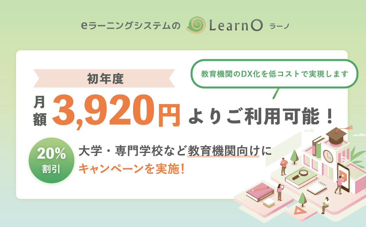 初年度は月額3,920円より。eラーニングシステム「LearnO(ラーノ)」教育機関向け20%割引キャンペーンを実施