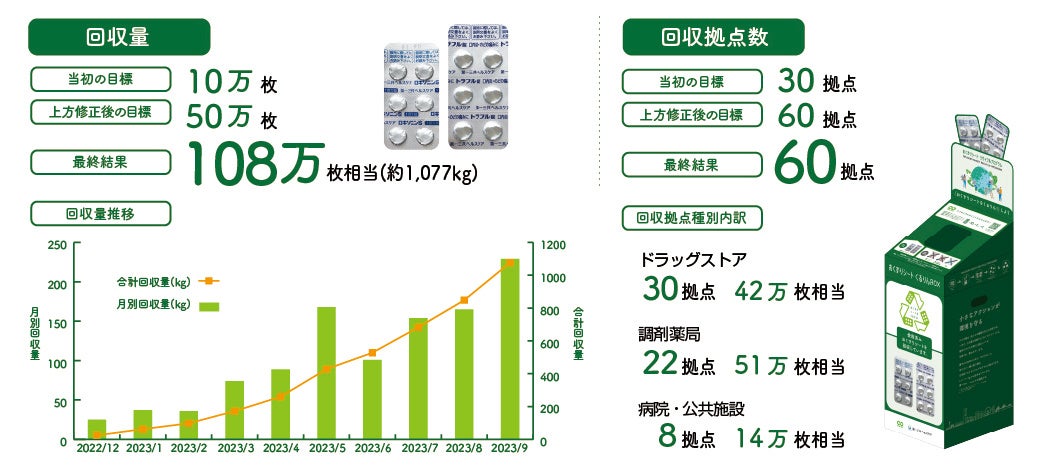 ・その後も回収拠点を増加しながら回収を進めた結果、拠点数は修正後の目標である60拠点に達し、回収量も修正後の目標の2倍以上となる108万枚相当(1,077kg)を達成。目標を大きく上回った。