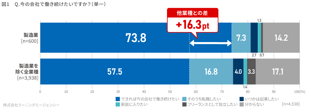 1. 「今の会社で長く働き続けたい」割合が他業種よりも15ポイント以上高く7割超