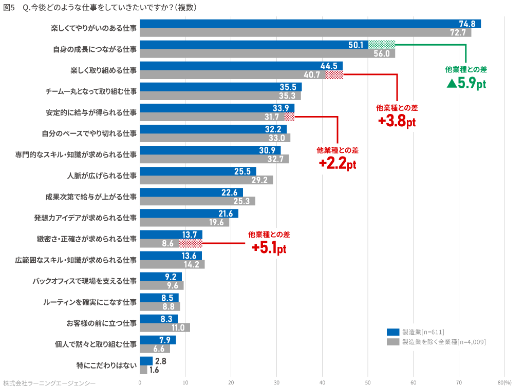 他業種と比較すると、1位の「楽しくてやりがいのある仕事(74.8)」は2.1ポイント、3位の「楽しく取り組める仕事(44.5%)」は3.8ポイント高い結果に。その他「安定的に給与が得られる仕事(33.9%)」「緻密さ・正確さが求められる仕事(13.7%)」はそれぞれ2.2ポイント、5.1ポイント高い結果となりました。2位の「自身の成長につながる仕事(50.1%)」は5.9ポイント他業種よりも低く、最も差が出る項目でした。(図5)