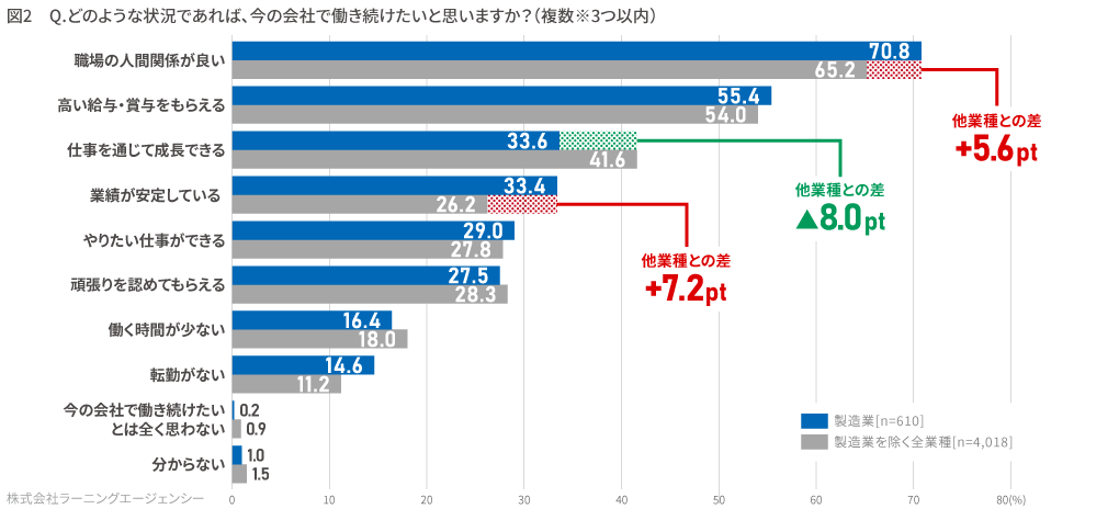 いずれも他業種と同じ順位でしたが、「職場の人間関係が良い」は5.6ポイント、「業績が安定している」は7.2ポイント高い結果に。一方3位の「仕事を通じて成長できる」は8.0ポイント低くなり、最大の差となりました。(図2)