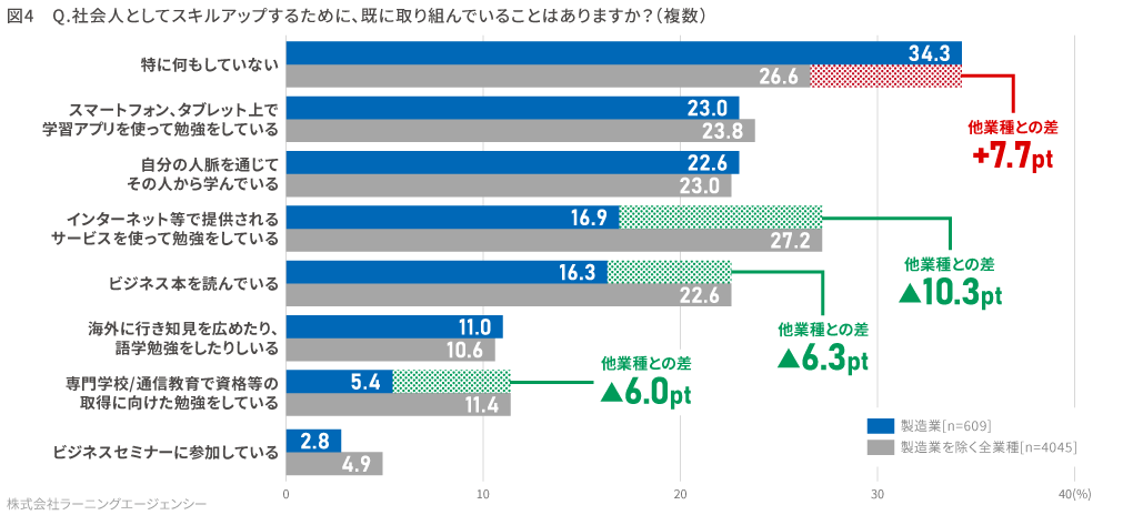 社会人としてスキルアップするために、すでに取り組んでいることはありますか」という質問では、製造業の新入社員は「特に何もしていない」と回答した割合が34.3%で、他業種より7.7ポイント高くなりました。他業種で1位となった「インターネット等で提供されるサービスを使って勉強している(16.9%)」は製造業では4位となり、10.3ポイント低い結果でした。他にも「ビジネス本を読んでいる(16.3%)」「専門学校/通信教育で資格等の取得に向けた勉強をしている(5.4%)」はそれぞれ6.3ポイント、6.0ポイント低い結果となりました。(図4)