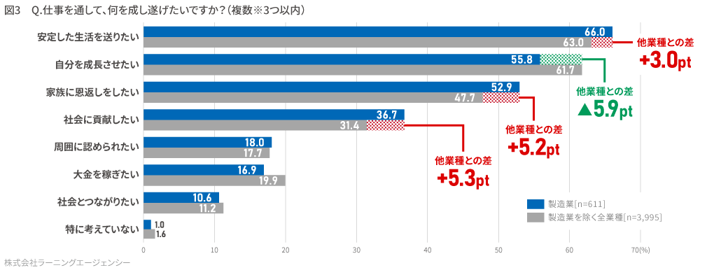 各割合を見てみると、「安定した生活を送りたい」は他業種よりも3.0ポイント高く、「家族に恩返しをしたい(52.9%)」「社会に貢献したい(36.7%)」はそれぞれ5.2ポイント、5.3ポイント高い結果となりました。一方、「自分を成長させたい」は5.9ポイント低い結果でした。(図3)