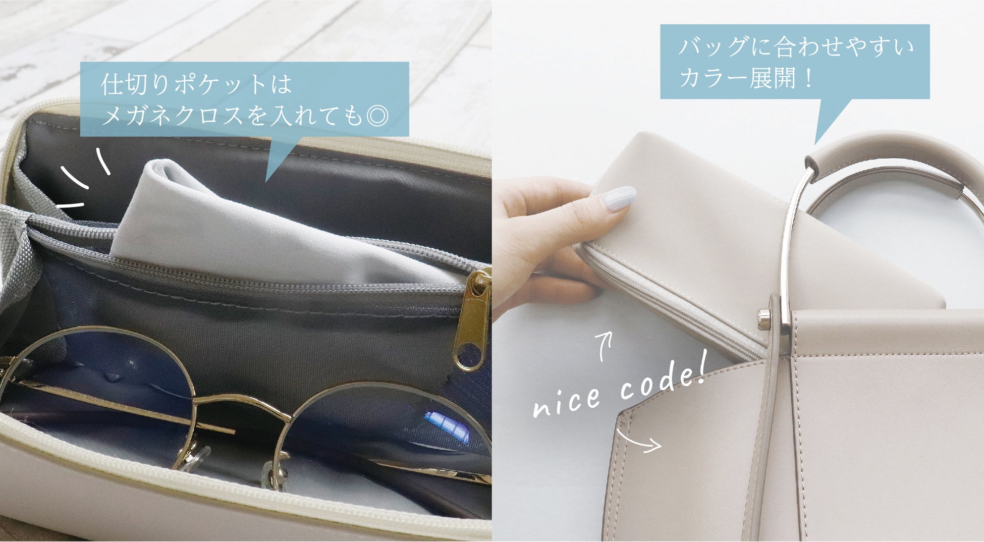 真ん中についている仕切りはポケットになっていて細かいアイテムやメガネクロスを入れるのがオススメ◎