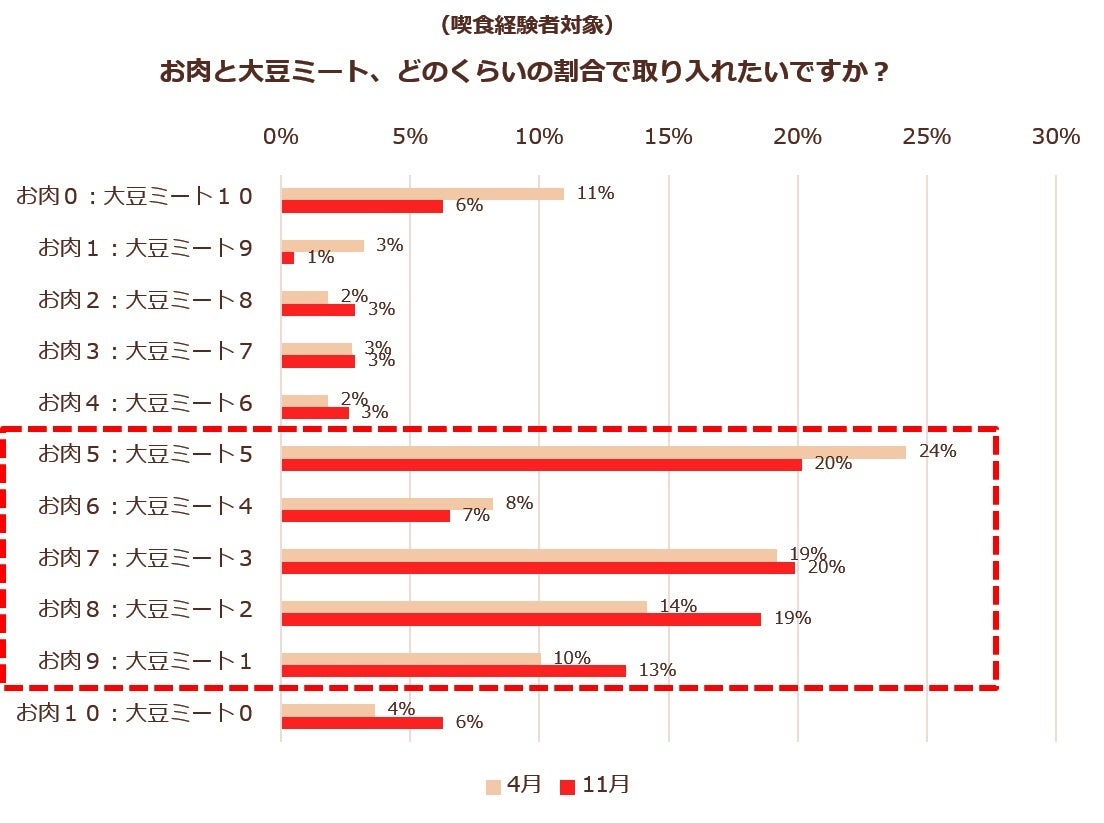 - 88%がお肉と大豆ミートを併用意向、約8割がお肉多めで時々大豆ミートを取り入れるバランスを希望。