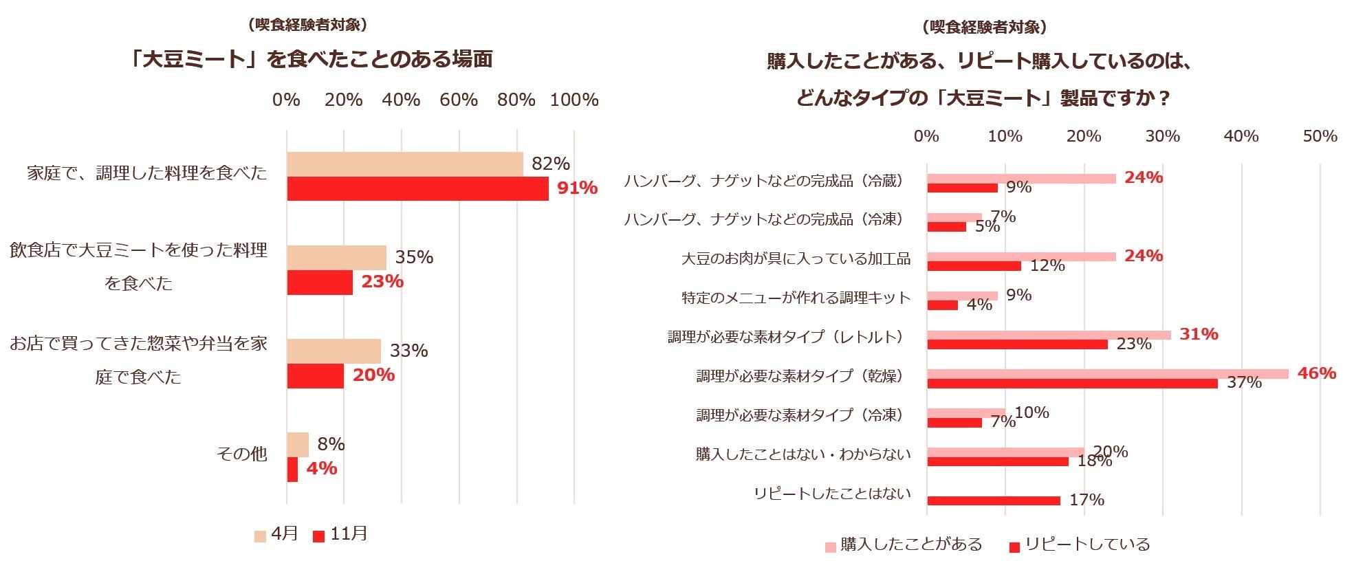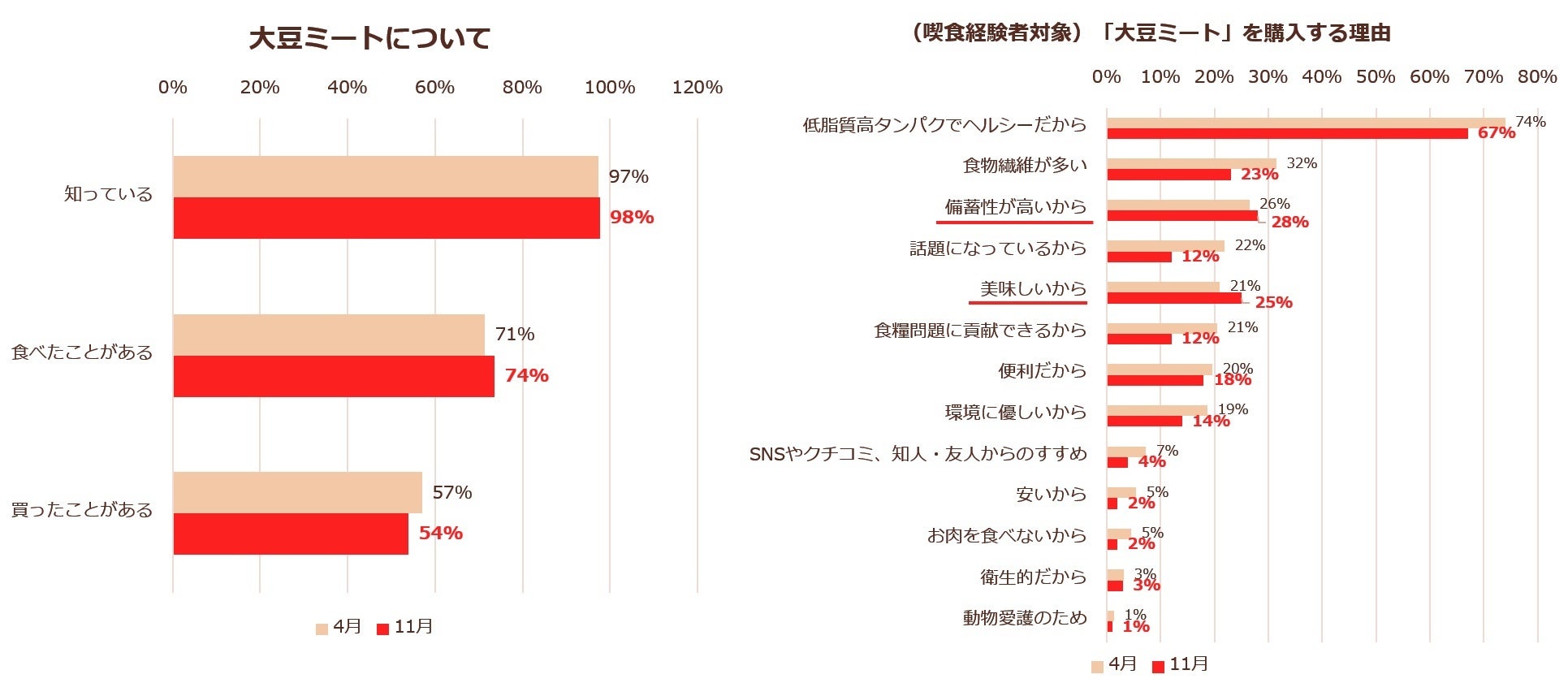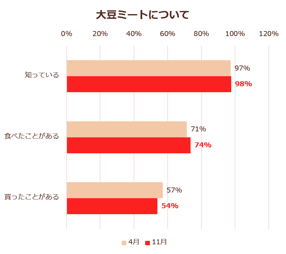 - 2022年11月時点での大豆ミートの認知率は98%、喫食経験率は74%、購入経験率は54%。4月からの低下は見られず横ばいに。