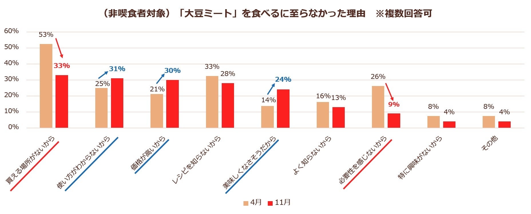 - 購入に至らない理由は、「買える場所がない」「必要性を感じない」が減少し「使い方がわからない」「価格が高い」「美味しくなさそう」が増加。