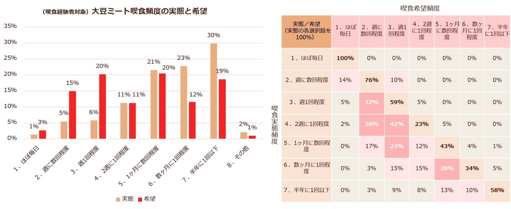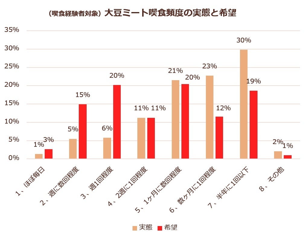 - 大豆ミート喫食経験者の38%が週1回以上、69%が1ヶ月に1回以上の頻度で喫食を希望。