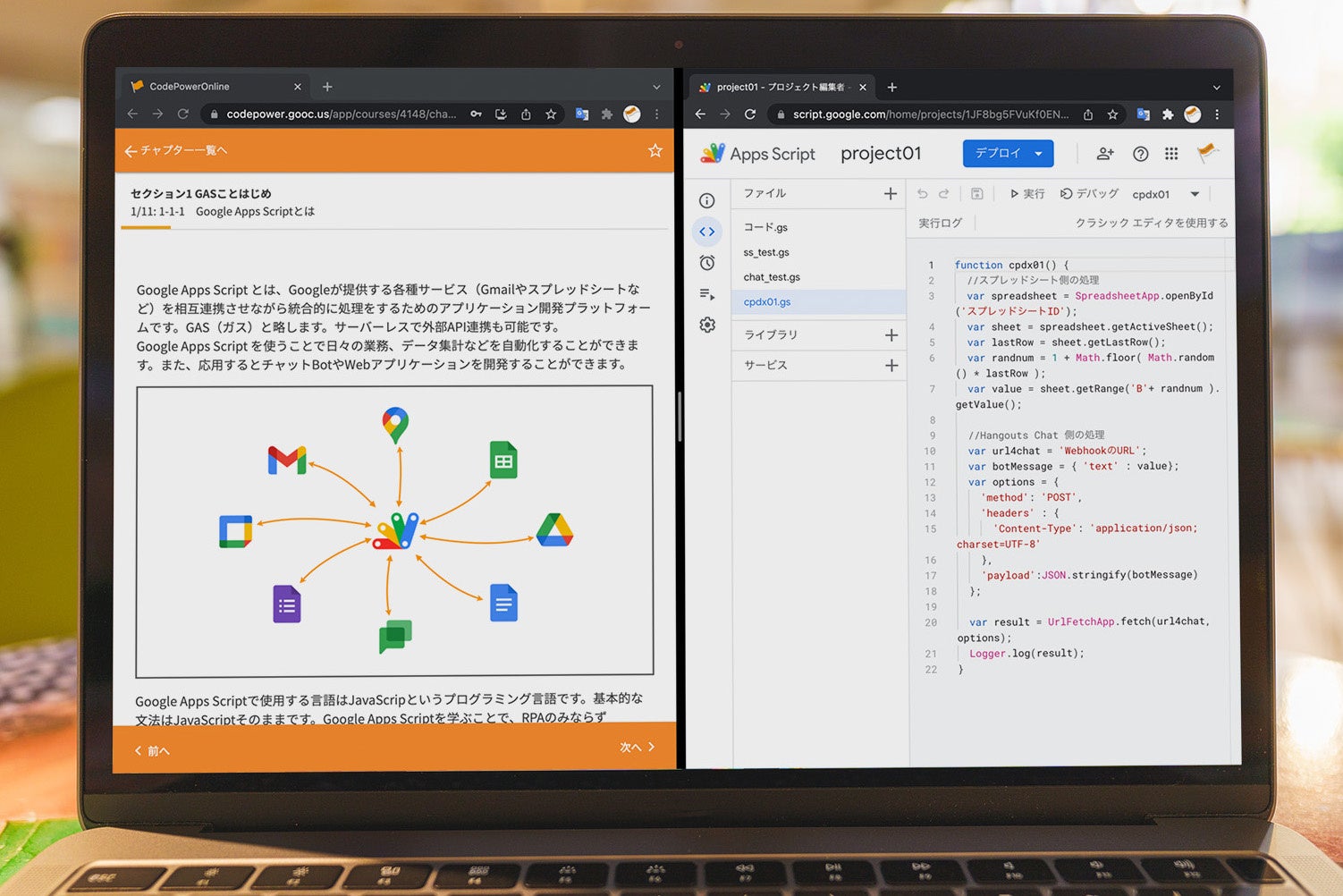 - Webアプリケーション開発プラットフォーム Google Apps Script(以下GAS)を教材とします。環境構築不要なので初日から学習を始められます。