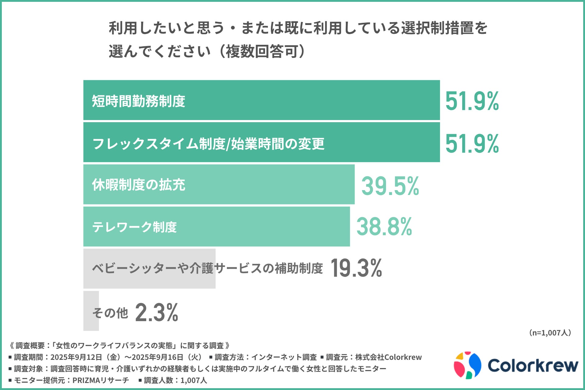 「利用したい、または既に利用している選択制措置」について尋ねたところ、『短時間勤務制度(通常より短い勤務時間で働ける制度)(51.9%)』『フレックスタイム制度/始業時間の変更(勤務時間帯を柔軟に調整できる制度)(51.9%)』が同率で最多となり、『休暇制度の拡充(子どもの急病や学校行事参加、出産準備などに対応できる制度)(39.5%)』と続きました。