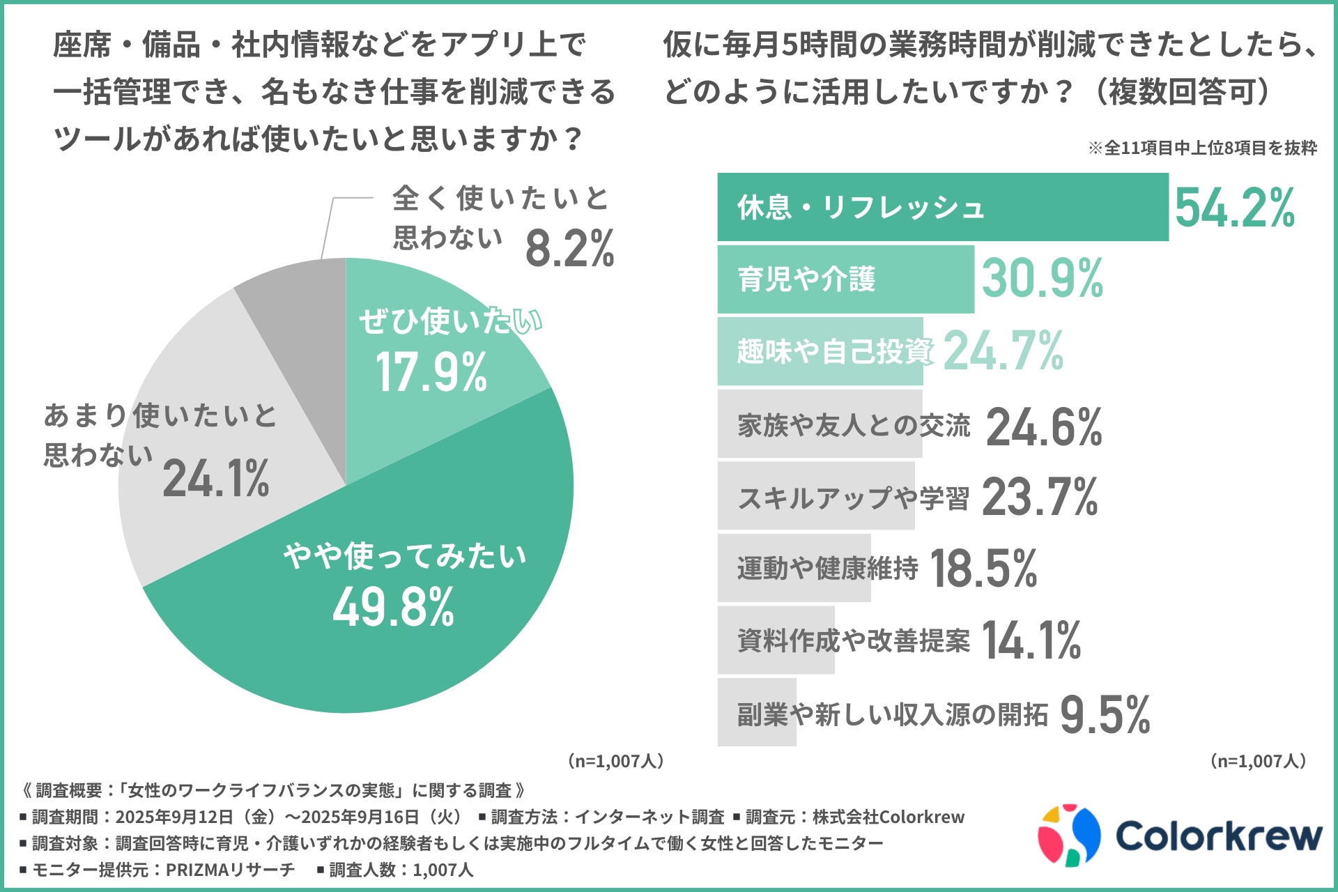 最後に、「業務時間が毎月5時間削減できた場合の使い道」について尋ねたところ、『休息・リフレッシュ(54.2%)』が最多で、『育児や介護(30.9%)』『趣味や自己投資(24.7%)』と続きました。