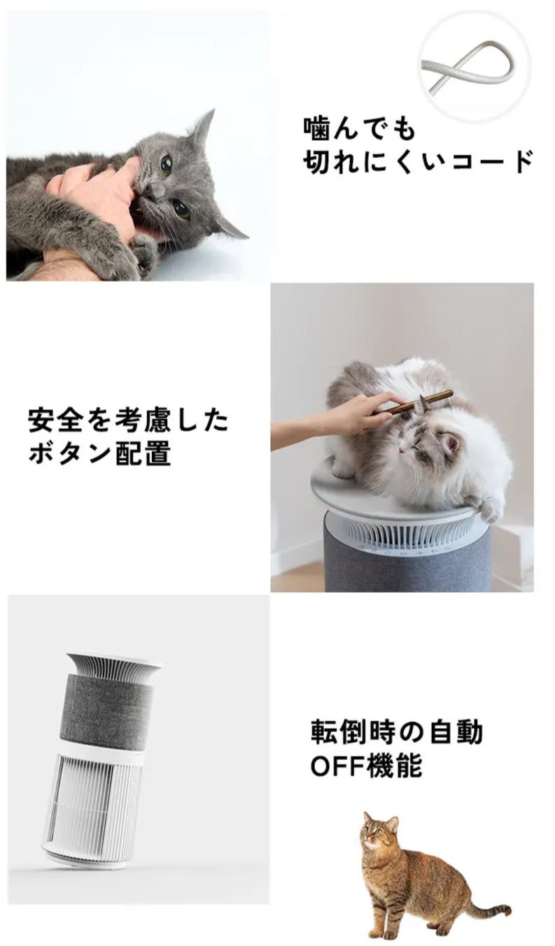 噛んでも切れにくい強化コードや、転倒時の自動電源オフ機能など、安全性を徹底。