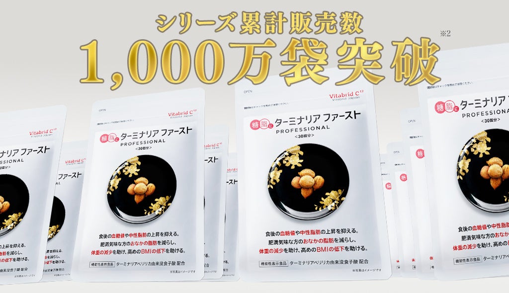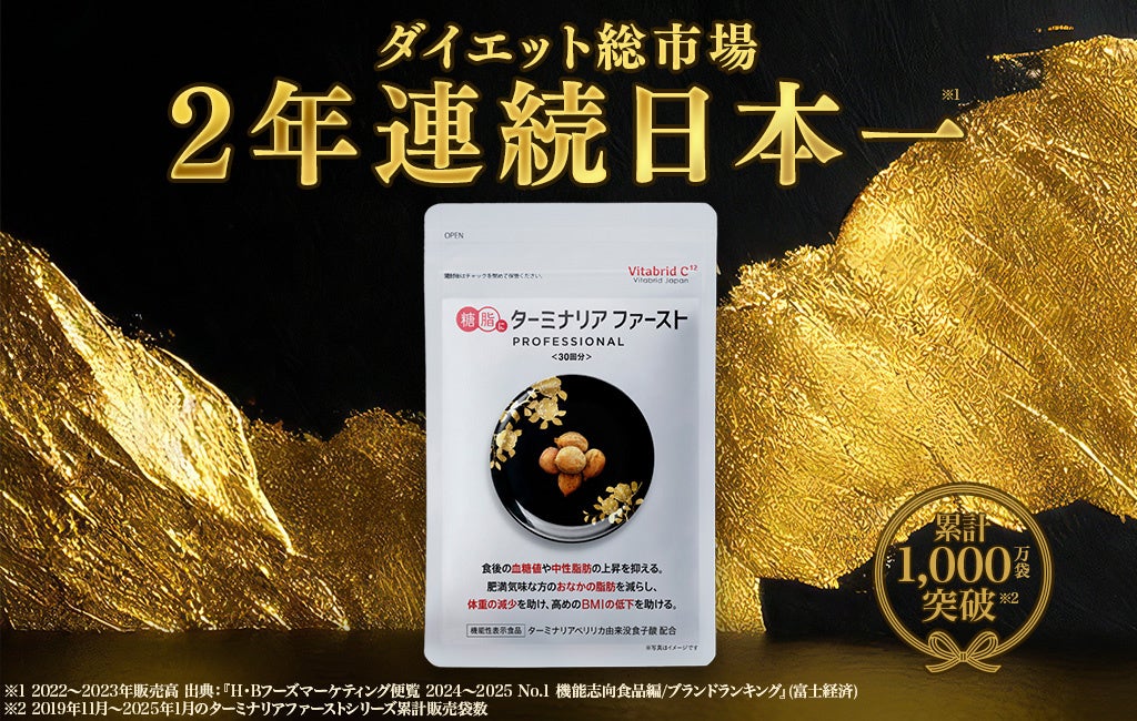 株式会社ビタブリッドジャパン(本社:東京都港区、代表取締役:大塚博史)が展開する、肥満気味な方の体重やおなかの脂肪を減らすのを助けるサプリメント「ターミナリアファースト」は、富士経済の調査結果において、多岐にわたる商品が存在するダイエット総市場で売上2年連続日本一※1を獲得いたしました。さらに、2024年の売上は90億円を上回り※3、身体を気遣う多くのお客様に、引き続きご愛顧いただいております。
