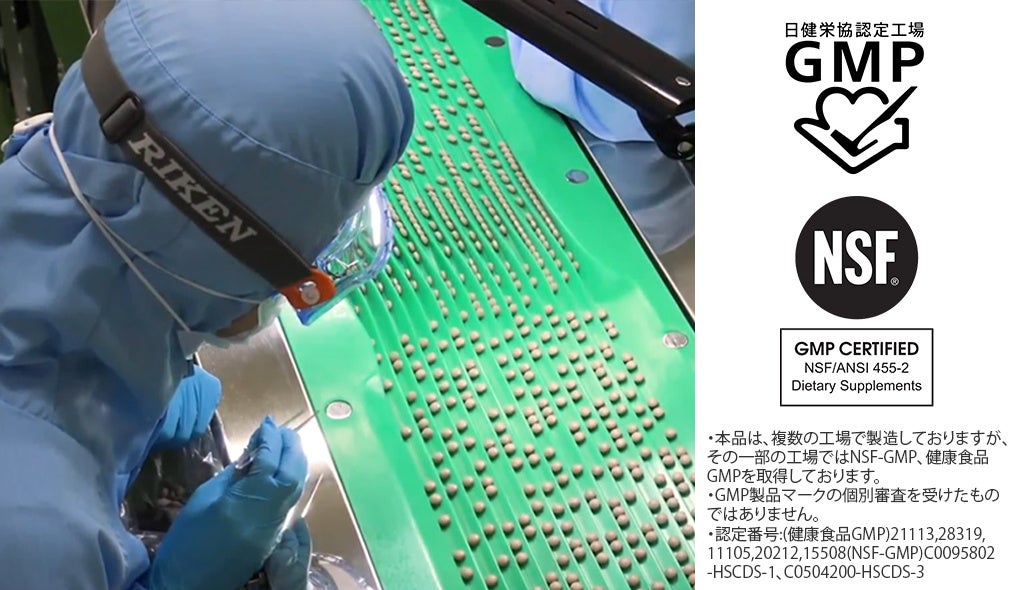 全て国内製造の「日本製」にこだわっています。また、健康補助食品の「GMP基準製造所」として認定された工場で、医薬品製造レベルの衛生面・品質面で製造しています。