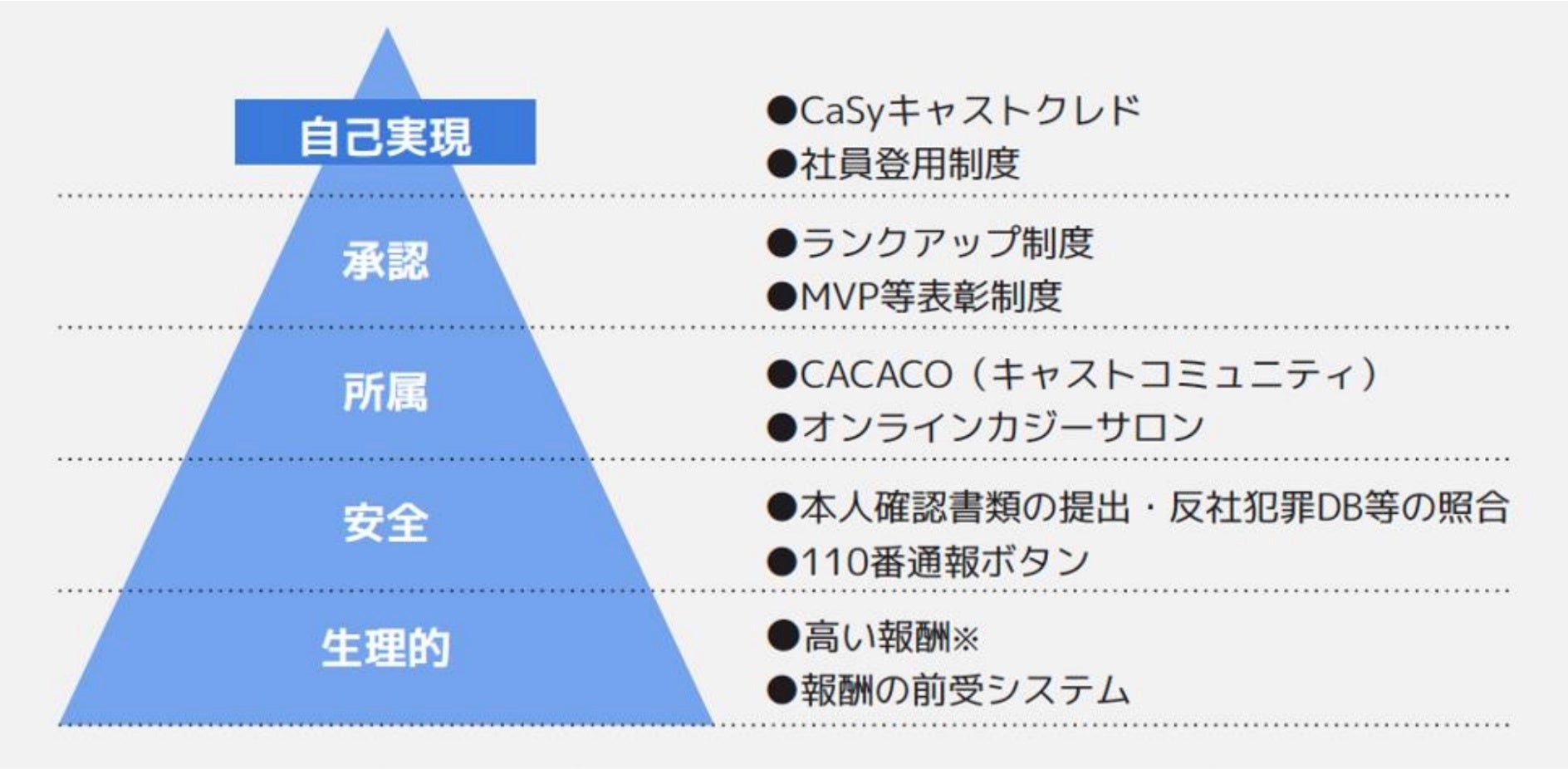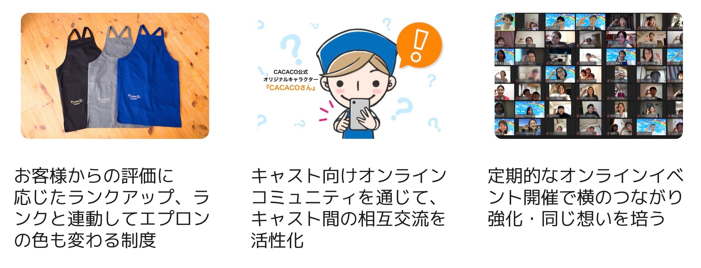 「マズローの欲求5段階説」に基づき、カジーで働くことを通じて成長・自己実現を実感できる仕組みを構築しています。例えば、「ランクアップ制度」。実施したサービスの件数とお客様からの評価に応じてランクアップしていき、エプロンの色も変化、1時間あたりの報酬も上昇していきます。そのほか、キャスト向けのオンラインコミュニティ「CACACO」では、キャスト同士で悩みを分かち合い、学習し高めあう場として、キャリアアップや成長につながる機会の提供を行っています。