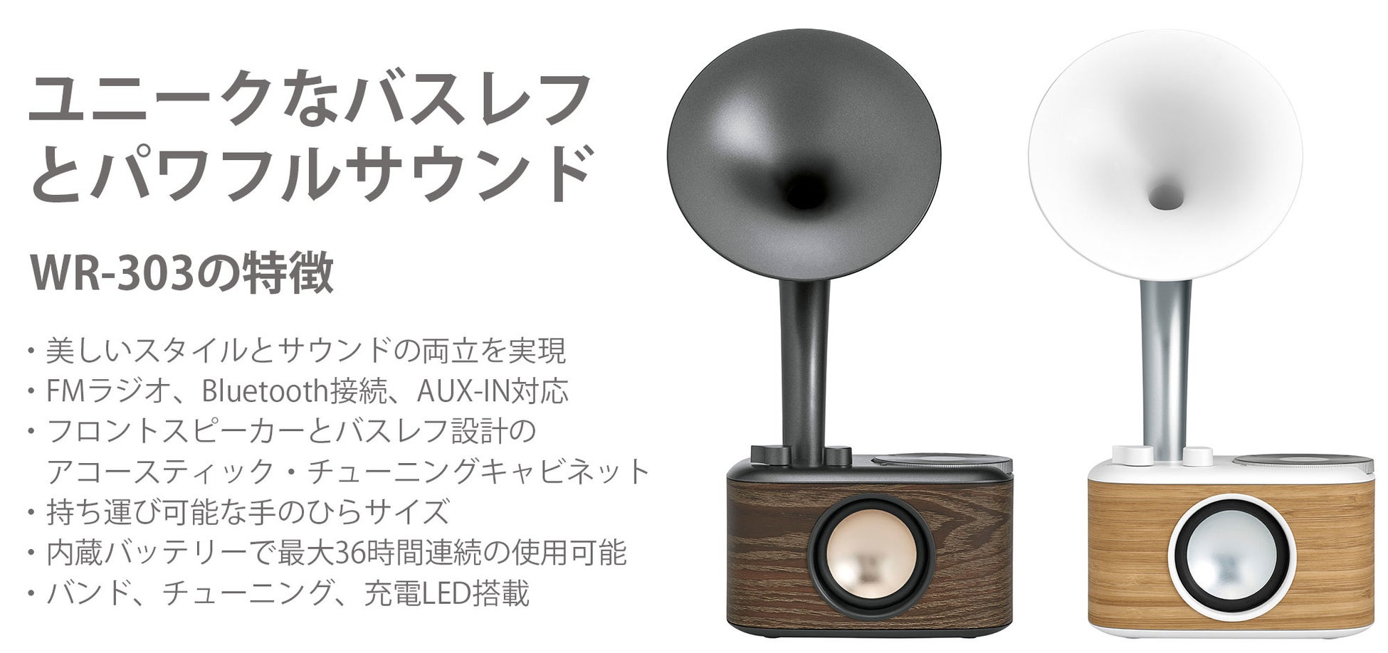 WR-303の音響調整されたキャビネットが、蓄音機を彷彿とさせるバスポートから溢れる豊かな低域のレスポンス、正面のスピーカーから奏でられるなめらかな中高音域とが一体となり、自然で聞きやすいサウンドを実現します。