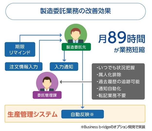 これまで手作業で行っていた、生産管理システムへの納期回答、出荷明細の入力がBusiness b-ridgeを介して委託先から直接情報連携できるようになり業務の効率化が実現いたしました。