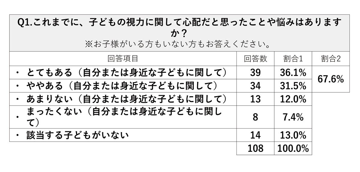 アンケートの結果、8割弱が、子どもの視力に関して心配に思ったり悩んだりしていることが分かりました。