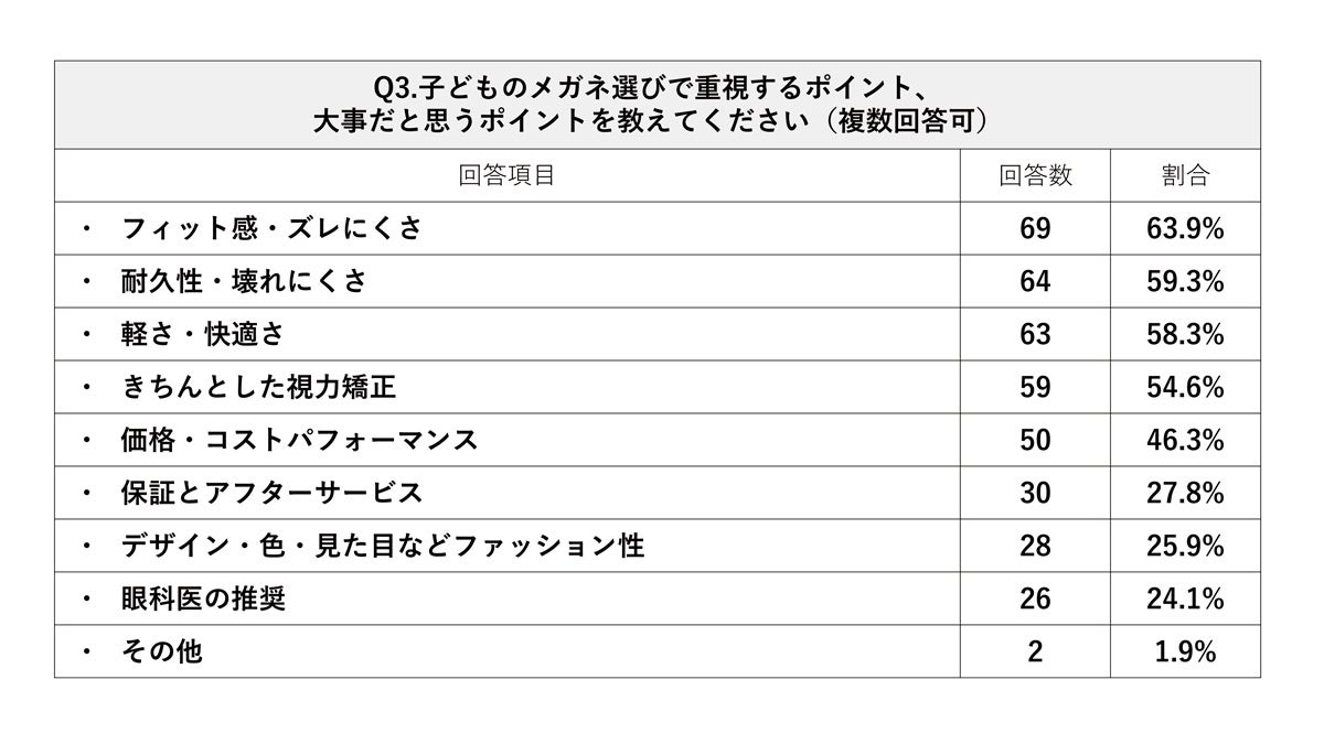 子どもの眼鏡選びで大事にするポイントでは、ファッション性よりも機能性を重要視しており、目の健康への意識の高さが伺えます。具体的には、「フィット感・ズレにくさ」(63. 9%)や「耐久性・壊れにくさ」(59.3%)、「軽さ・快適さ」(58.3%)、「きちんとした視力矯正」(54.6%)は5割以上が重視し、「デザイン・色・見た目などファッション性」(25.9%)を重視するのは4人に1人程度にとどまりました(複数回答可)。