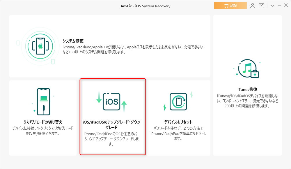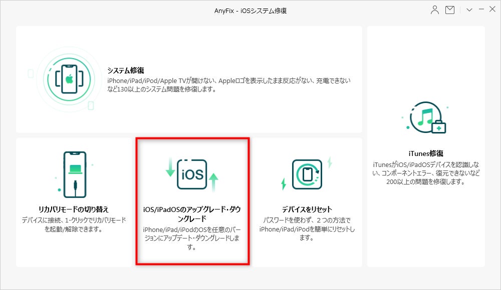 2>AnyFixを起動してから、iPhoneをUSBケーブルで接続して、「iOS/iPadOSをダウングレード・アップグレード」機能を選択します。