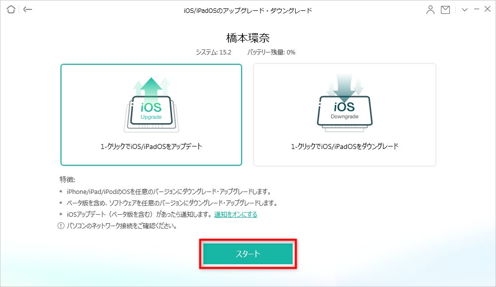 3> 1-クリックでiOS/iPadOSをアップグレードを選択してから、「スタート」ボタンをクリックしてください。