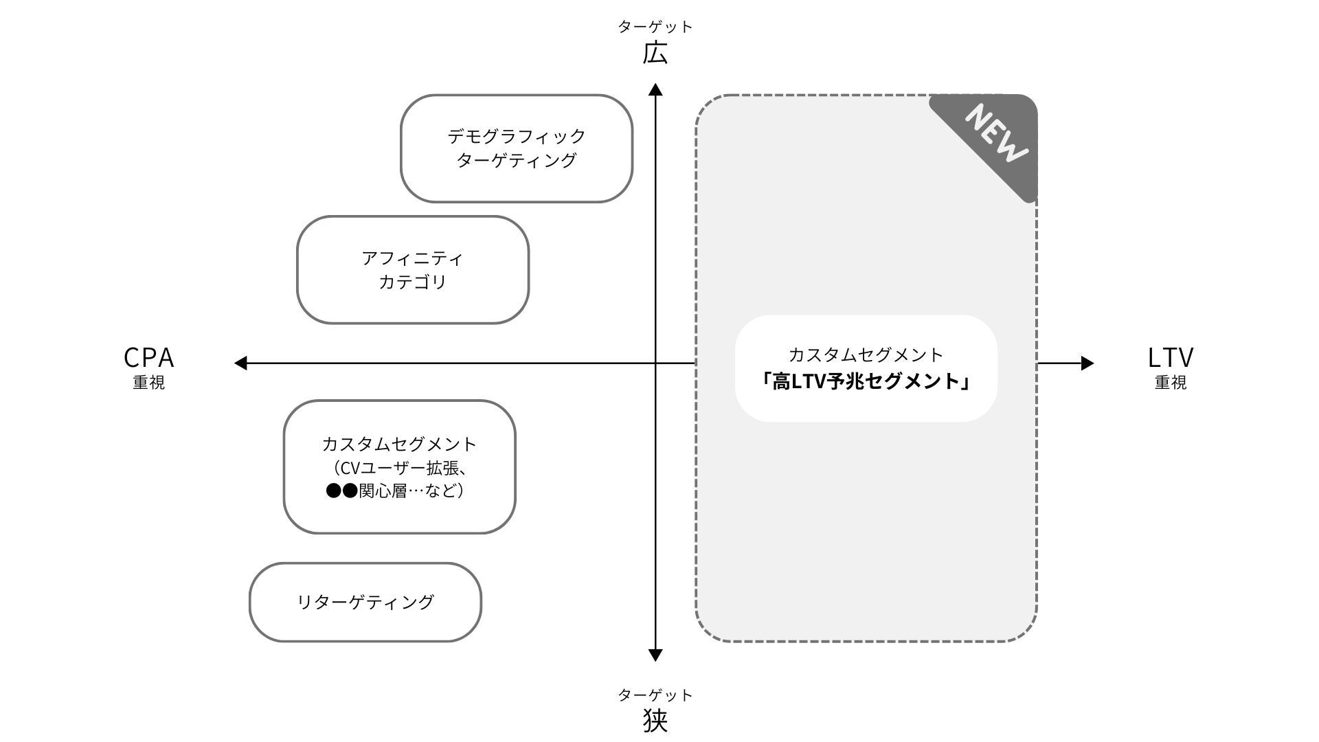 D2CではdADNWを中心に、契約者情報に基づく「デモグラフィックターゲティング」、dポイントクラブ会員の属性・行動・興味関心データを用いた「アフィニティカテゴリ」、Cookieレス環境下に対応した「リターゲティング」など、様々なセグメントやターゲティングメニューをご提供してまいりました。これらのメニューは顧客獲得単価(CPA)が高く効率的な広告配信が見込める一方で、昨今では急速な人口減少を背景に顧客生涯価値(LTV)を重視したマーケティングも注目されています。