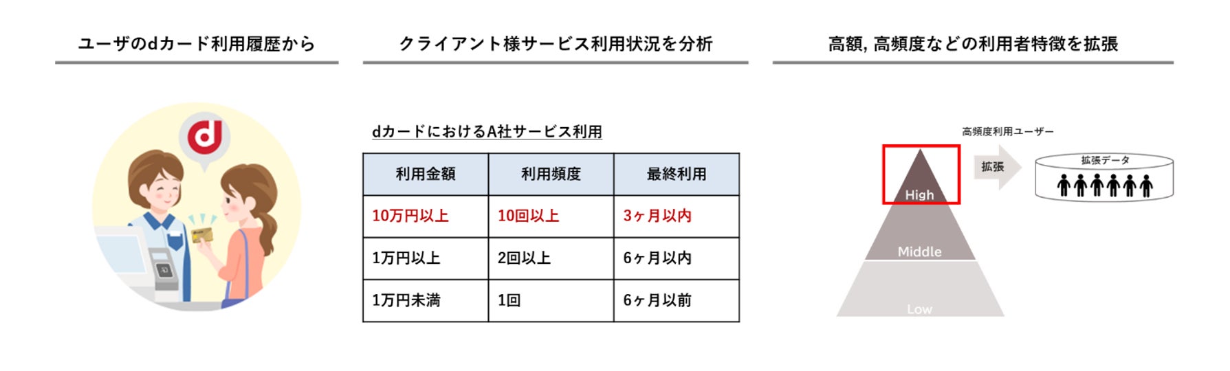 今回新たにカスタムセグメントとして追加したセグメントは、約11兆900億円のdカードやd払いなどの決済データ(※2)から、顧客企業などの決済データを抽出しRFM分析を実施することで、「顧客企業の高LTVユーザー」をとらえることを可能としました。また、この「顧客企業の高LTVユーザー」を拡張し、高LTV予兆セグメントを生成して広告配信を行うことで、高LTVユーザーの獲得と、クライアントの長期的価値の創出を目指します。