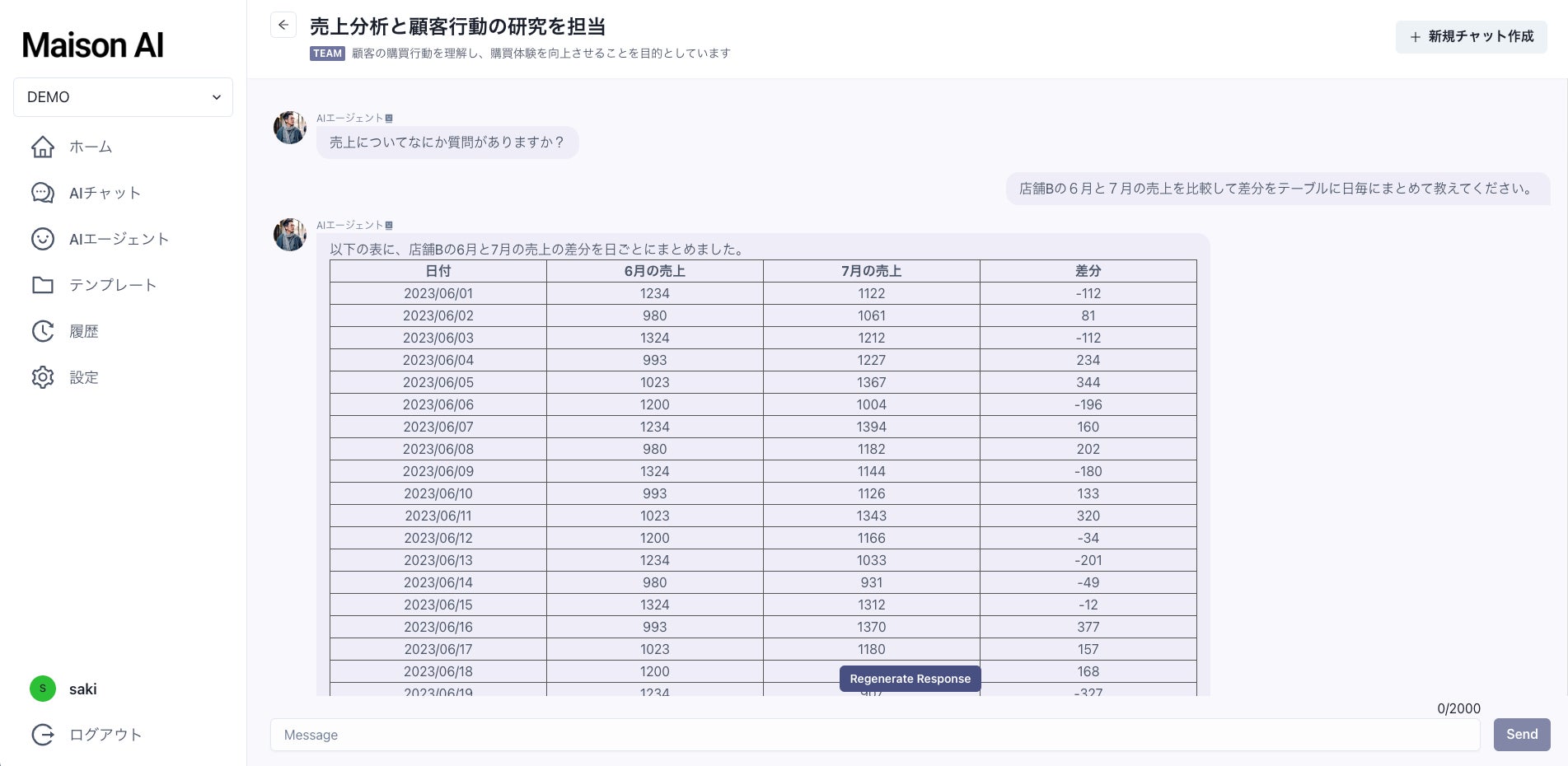 AIに特定の職種を設定することで前提知識が必要な質問でも、より精度の高い回答を得ることが出来ます。ファッション業界に特化した「Maison AI」では、人事や法務だけでなく、ファッションデザイナーやパタンナーのAIエージェントも用意しています。