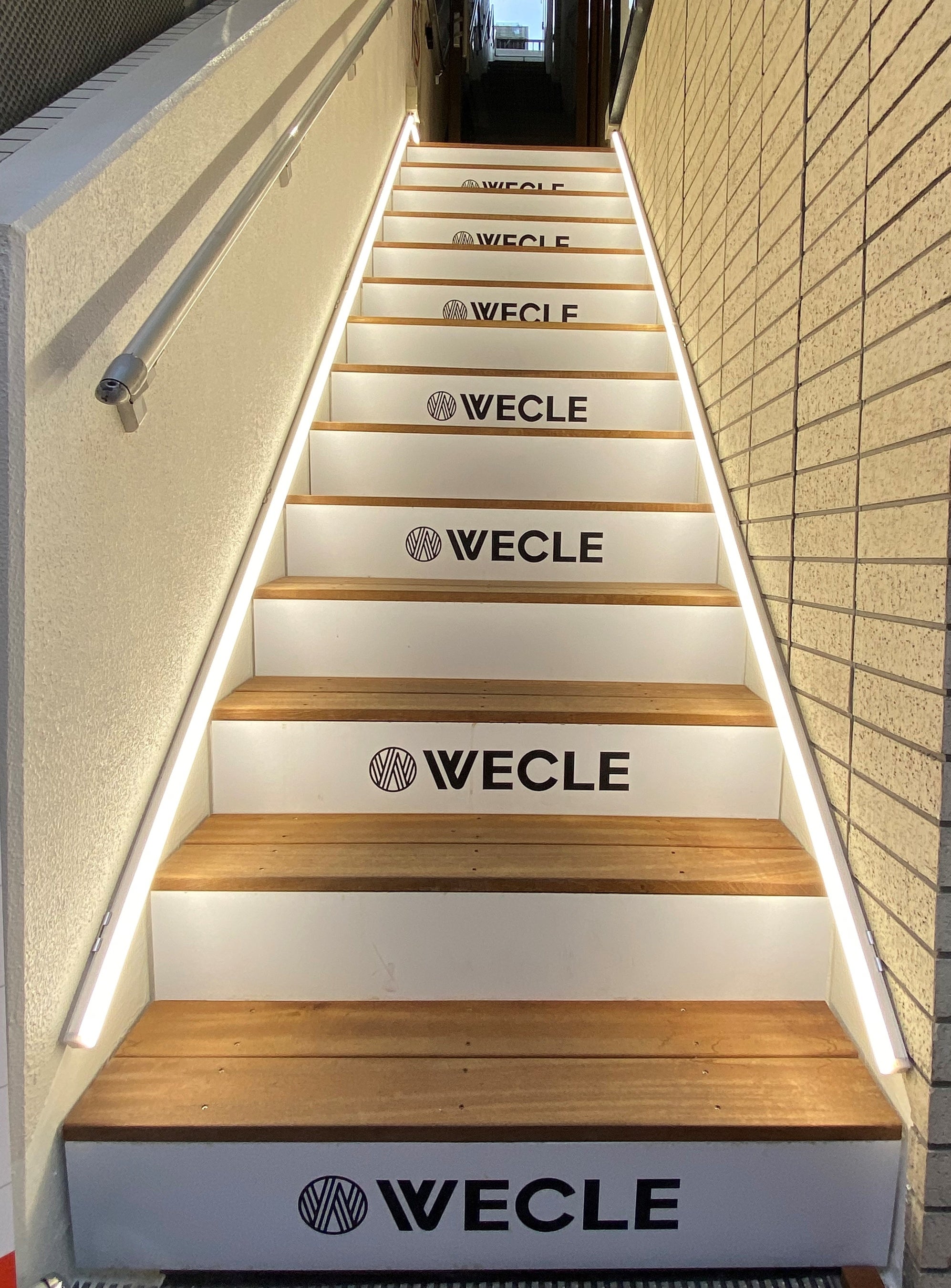 右)店内へと続く木目と白を基調にした光の階段でお客様をお迎えいたします