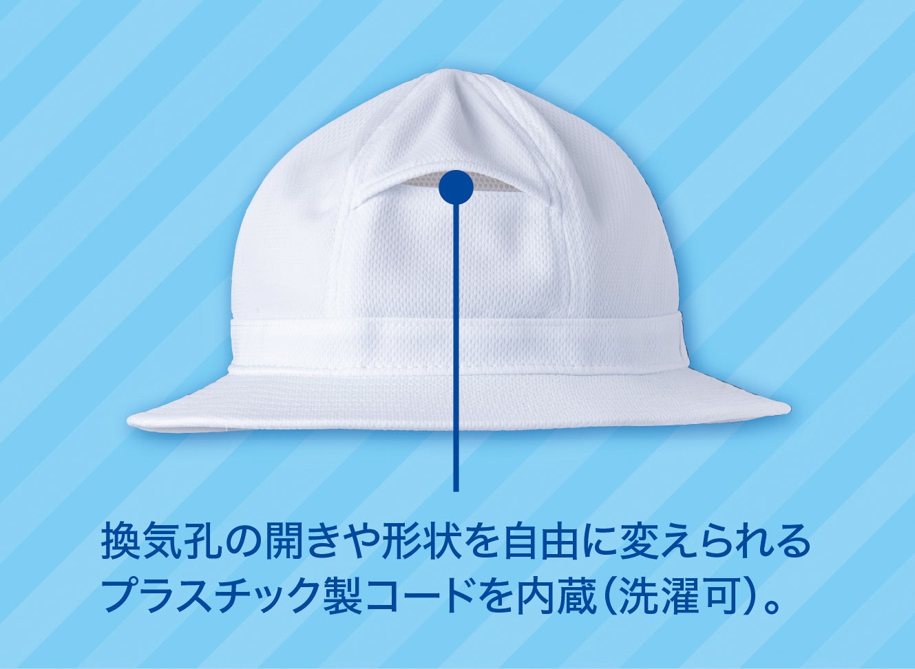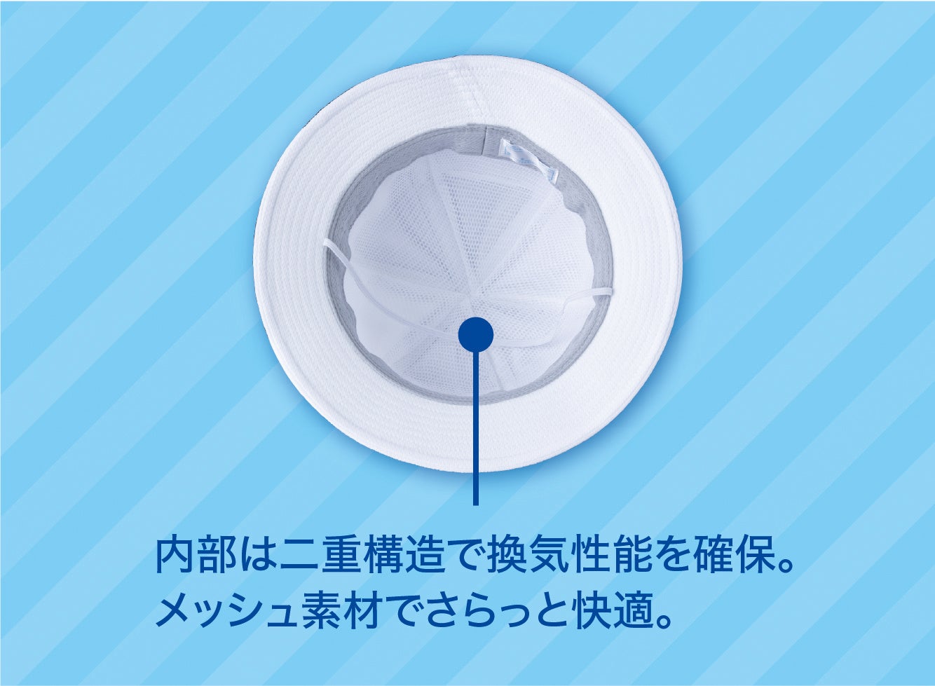 内部を二重構造にすることで、頭と帽子の間に空間ができ、空気の通り道を作ることで換気性能を確保。さらに、頭と接する内側の面はメッシュ素材を使用し、汗をかきやすい頭部を快適な状態に保つ。