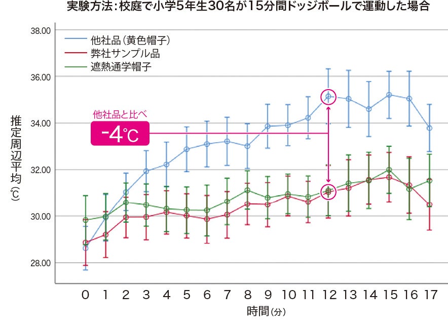 一般的に広く使われている黄色い通学帽子と「遮熱通学帽子」の推定周辺平均温度を比較したところ、最大で-4℃も推定周辺平均温度上昇を抑える効果があると分かりました。