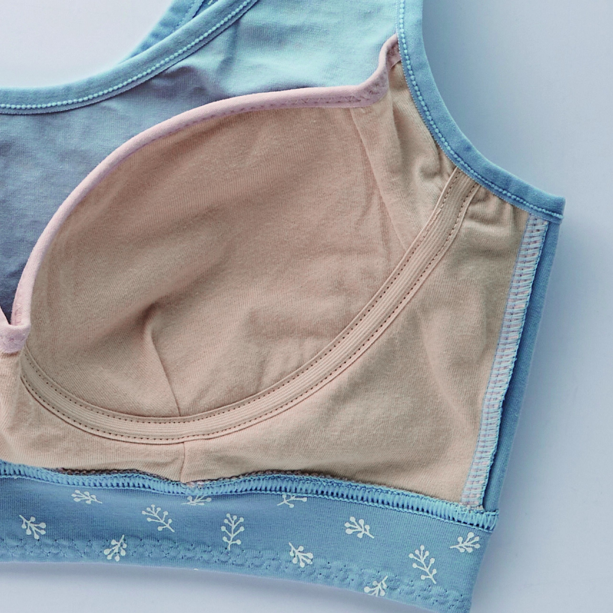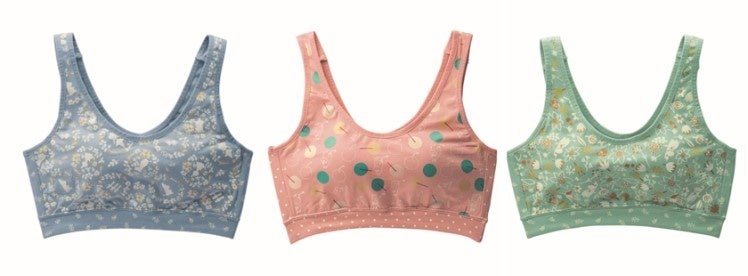 デザイン面では、大人の女性が普段から手に取りやすいような、ナチュラルなデザインをあしらいました。また機能面では、締め付けが苦手な方も着用できるノンワイヤー設計、身生地は綿混素材でゴムが直接肌に触れない優しい肌触りと着心地にもこだわりました。