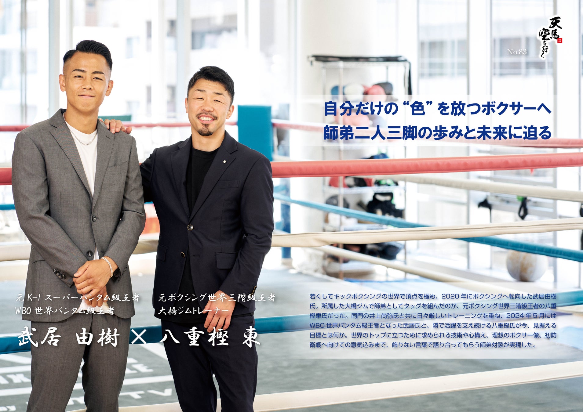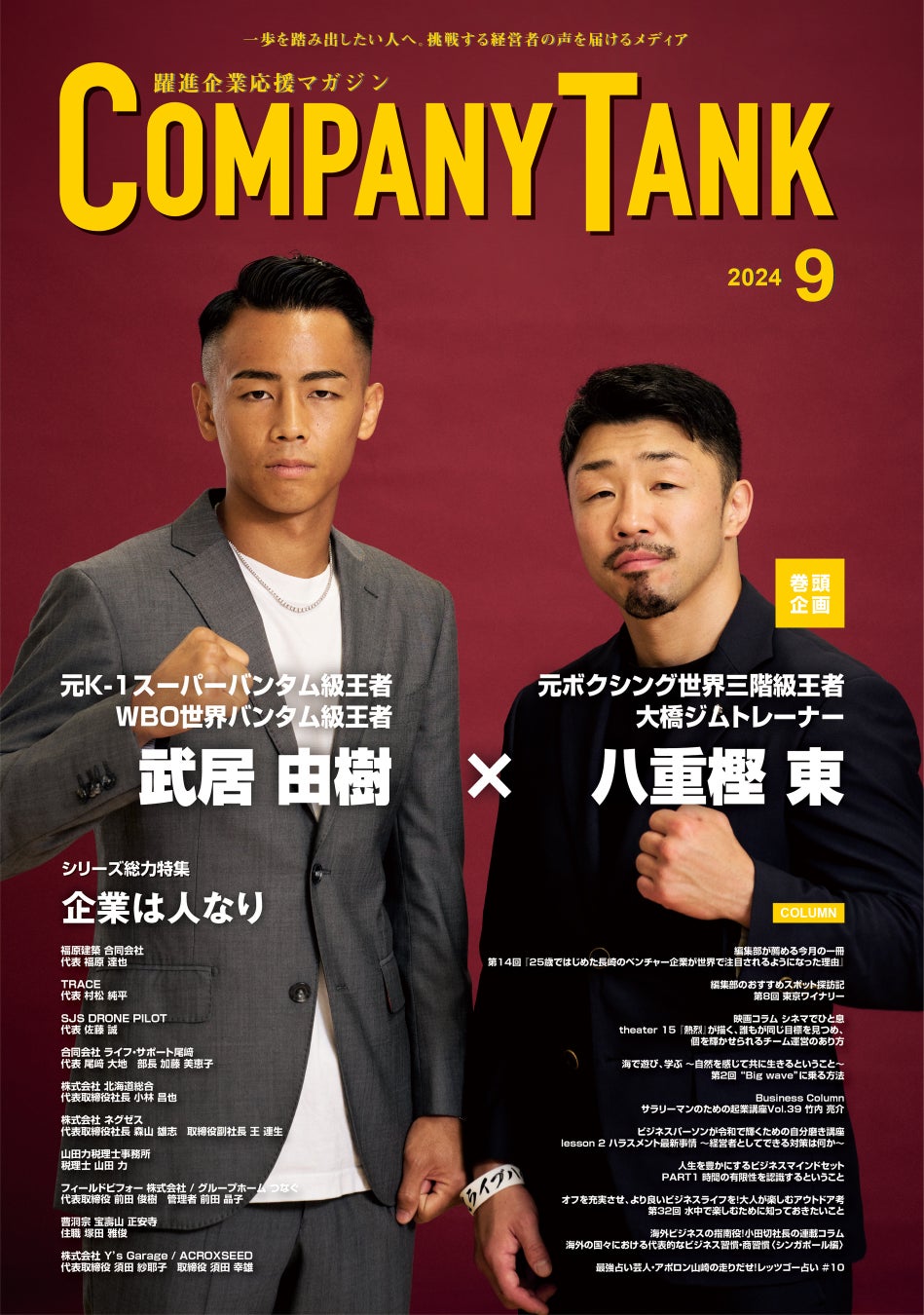 一歩を踏み出したい人へ――挑戦する経営者の声を届けるビジネス情報誌「躍進企業応援マガジン COMPANYTANK(カンパニータンク)」2024年9月号を9月1日(日)に発売いたします。巻頭企画の「天馬空を行く」では、元K-1 スーパーバンタム級王者・WBO 世界バンタム級王者の武居 由樹さんと、元ボクシング世界三階級王者で、現在は大橋ジムのトレーナーを務める八重樫 東さんとの師弟対談が実現。10ページにわたるロングインタビューを掲載いたします。