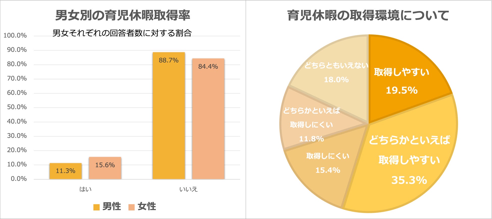 | 【TOPICS】 ・87.2%がこれまで育児休暇を取得した経験がないと回答 ・勤務先で育児休暇を取得しやすい環境にあると54.8%が回答 ・82.0%が今後対象になった際に育児休暇を取得したいと回答 ・60.1%が育児・介護休業法の改正に期待感を持っている ・期待することは「休暇取得のしやすい環境になること」が男女とも最多 |