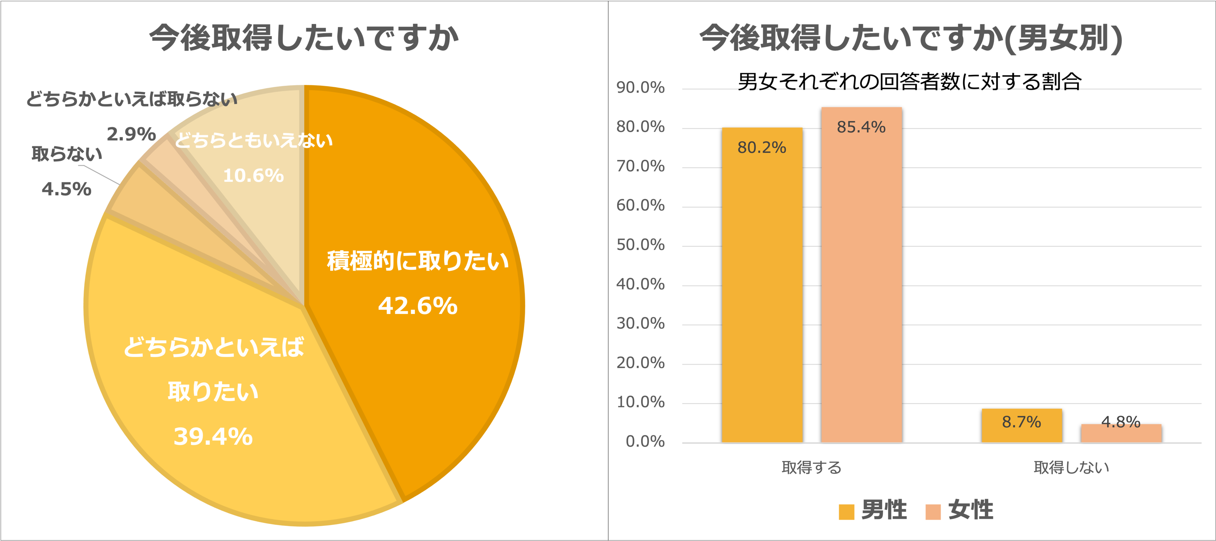 またこれを男女別で見ていくと、男女ともに8割以上が取得したい派の回答で女性が若干数多い割合で取得への希望を持っていることがわかりました。