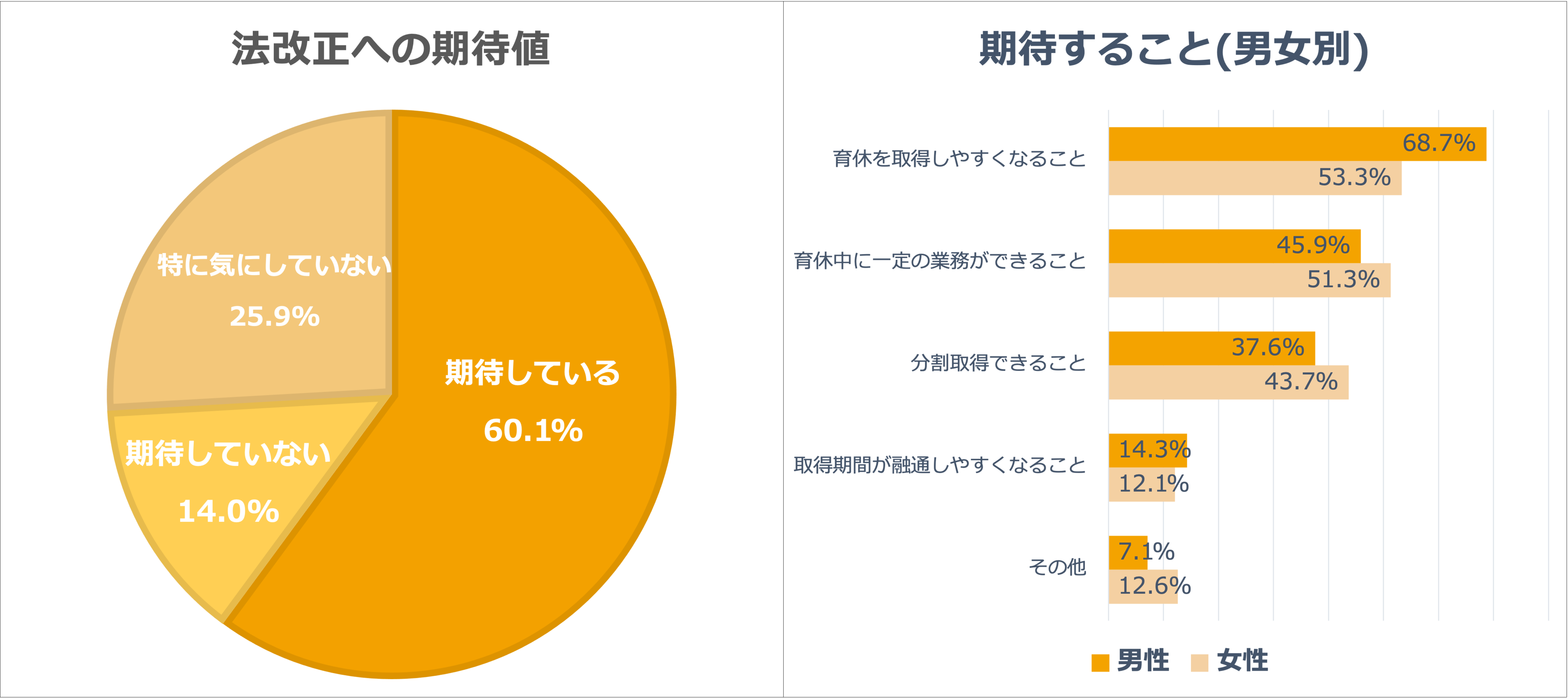 また、期待することについては「育休を取得しやすくなること」が男女ともに最多回答で、男性は68.7%と女性が53.3%という結果になりました。