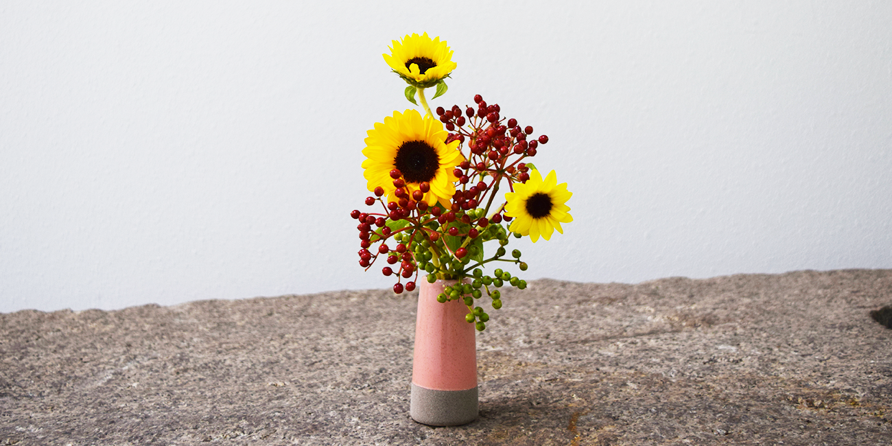 秋に向けて徐々に赤く色づいていく実。 夏の象徴とも言えるヒマワリの花との組み合わせで季節の移ろいを感じることができるいけばなです。