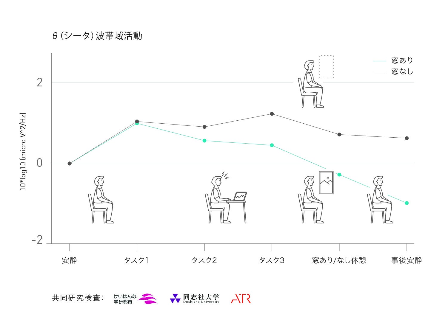 さらに、窓のない空間においてAtmoph Windowを設置した時とそうでない時で、負荷タスク後の脳波活動を計測した結果、Atmoph Windowがある時の方がストレスからの回復が早いことがわかりました。窓から見える景色と音を体感することで、生活や仕事の場面でもリラックスに寄与すると考えられます。(同志社大学三木研究室監修の下、株式会社ATR-Promotionsとの共同研究より)