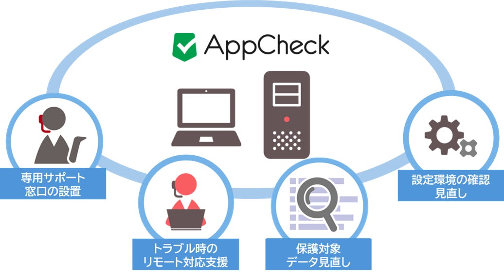 この運用支援サービスはクラウド版、サーバー版、PC版の3種類をラインアップし、専用サポート窓口の設置、トラブル時のリモート対応支援、保護対象データの見直しといったサポートを行います。さらに管理画面の確認方法やアラートが出たPCの詳細な情報を確認する方法のレクチャーに加えて、年1回「AppCheck」の設定環境の確認・見直しを実施することで、システム環境に変化があった際も、ビジネスを止めることなく安心して業務を行える環境づくりを支援します。