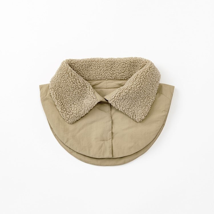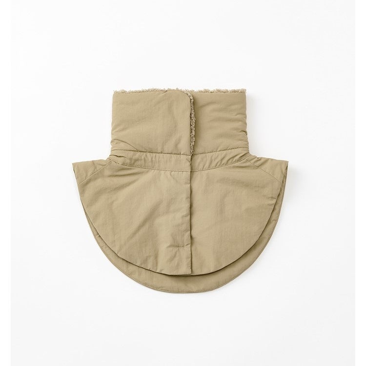 子どものよだれから服を守るため、従来のネックウォーマーより身頃部分を大きくしたデザインが特徴です。アウターの上からも纏うことができ、スタイリッシュさを際立たせるラウンドフォルムに整えました。