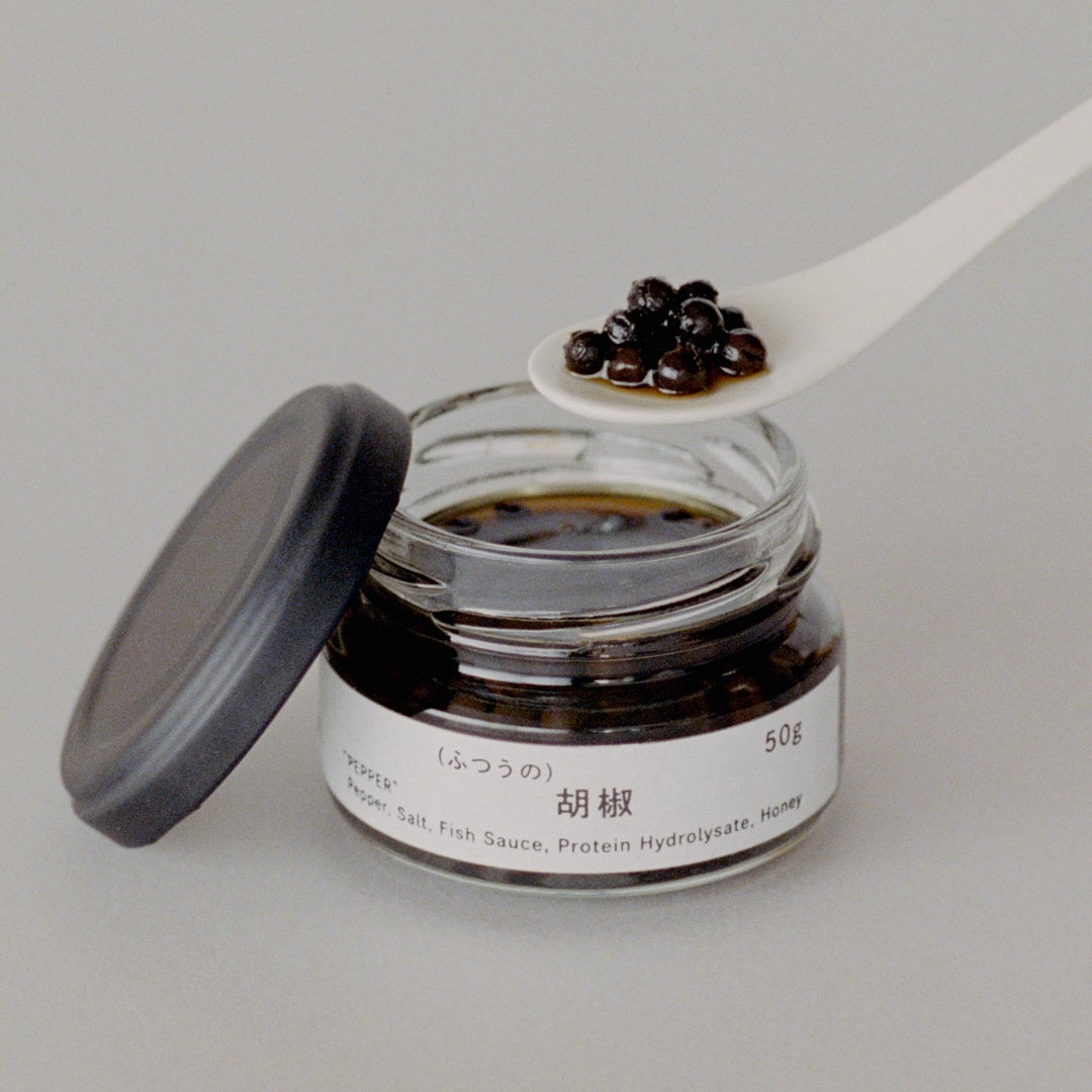 うま味がありながら角が自然とない生胡椒が、口の中で弾けるような食感を味わってほしい。そんな想いから、胡椒を漬け込むことで、表面をやわらかくしました。この胡椒は、優しい味わいと弾ける心地よさで、普段の料理をよりおいしくします。