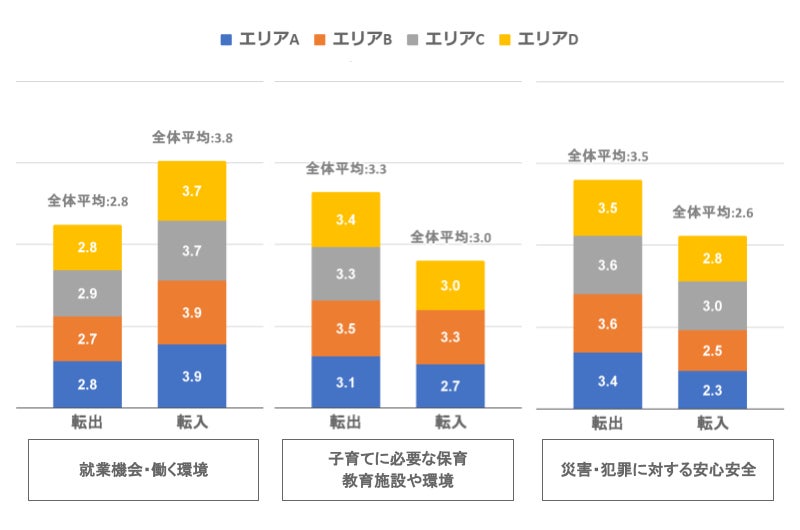 一方、転入者には高評価でも、転出者には低評価なのが「就業機会・働く環境」。エリア別に見ても、A〜Dの全ての地域で評価が下がっています。転入転出理由のトップが「仕事環境の変化」でしたが、自治体における就業機会の評価の改善が、今後の移住定住の成果に繋がるはずです。