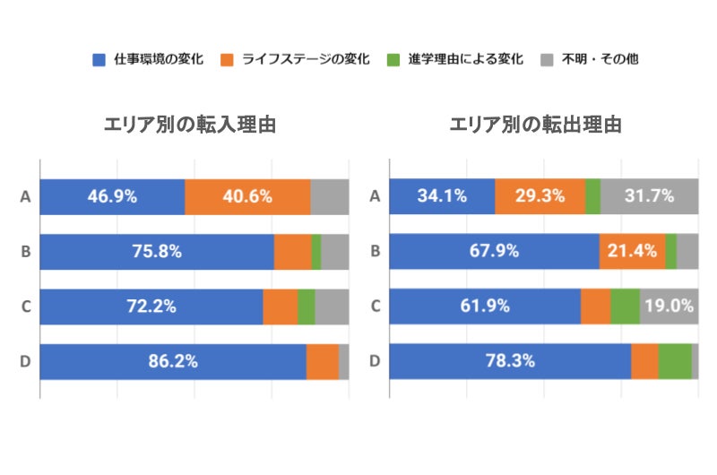 転出者も同様の傾向にあり、転出理由は「仕事環境の変化」が61.7%で最多。エリア別に見ても転入者の状況と同じく、エリアAの34.6%に対し、エリアDは78.3%と2倍の差がありました。近隣からの転出転入は、仕事よりも「家の購入・賃貸、相続、結婚、介護、離婚、別居」といった家族間におけるライフステージの変化と回答する比重が高いです。