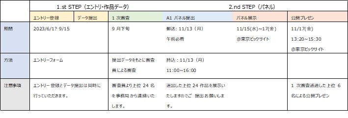 学生プロジェクトデザインコンペティション2023は募集作品の中から、1次審査(非公開)で審査員が上位入賞(会場展示)24作品、そのうち最終審査対象となる作品6点を選定します。最終審査対象となった方には11月17日(金)に東京ビッグサイトにて開催される最終審査会でプレゼンテーションをしていただき、公開審査の上で最優秀作品を決定します。会場展示作品については、会場での一般投票による会場投票賞の対象となります。