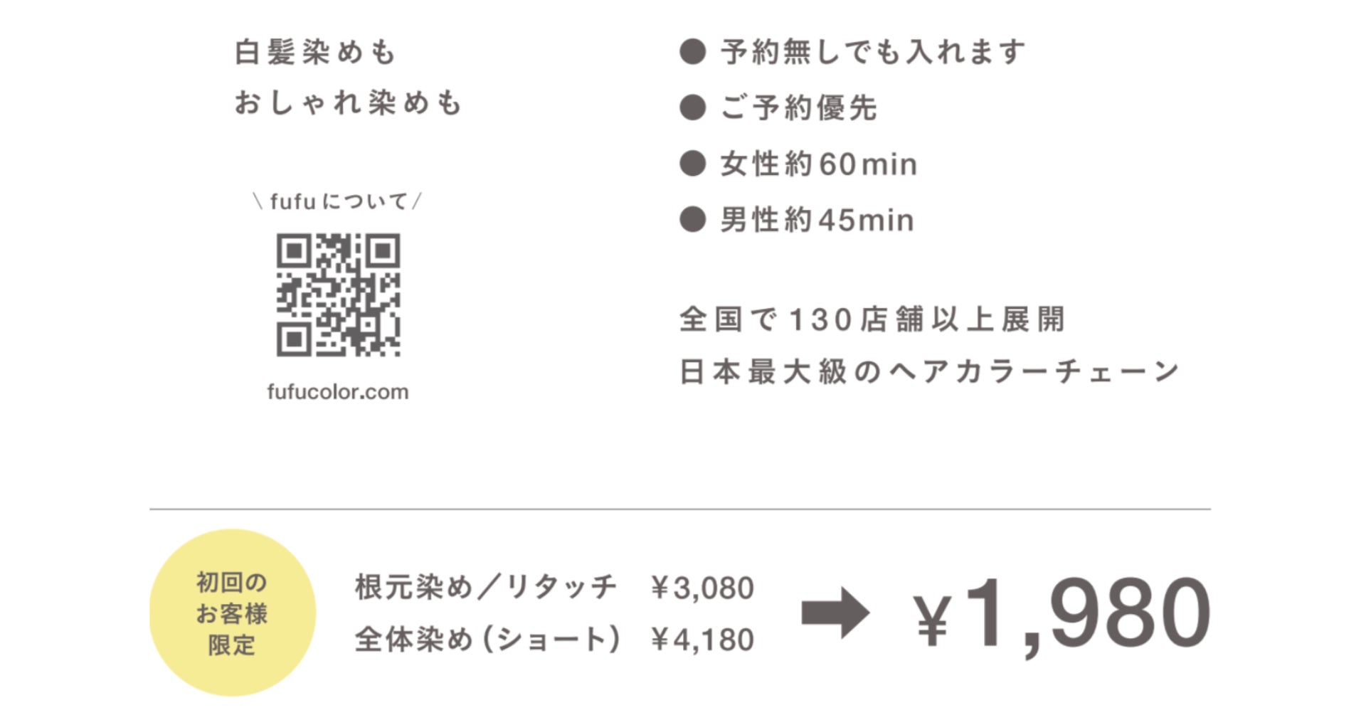 fufuを初めてご利用いただく方全員に、根元染め(リタッチ)税込3,080円または全体染め(ショート)税込4,180円を、税込1,980円でご提供いたします。