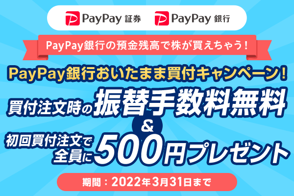 「資産運用を、より身近に。」をミッションに運営するスマホ証券 PayPay証券株式会社(東京都港区、代表取締役:内山 昌秋、以下「PayPay証券」)は、2021年12月20日から「PayPay証券」アプリ内においてPayPay銀行を「おいたまま買付」サービスの対象としています。今回PayPay銀行との連携を記念して、2022年1月18日(火)から3月31日(木)までの期間に、PayPay銀行の預金残高を使ってPayPay証券で2万円未満の有価証券等の買付を行った場合、通常発生する振替手数料が無料となるキャンペーンを実施します。