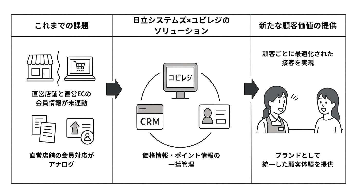 今回の取り組みでは、クラウドPOSレジ「ユビレジ」がCRM、基幹システム、会員システムと連携し、「ユビレジ」上で会員情報・ポイント情報の取得や、価格情報の一元管理を行っています。これにより、複数システムを横断した情報活用が可能となり、業務効率化とサービスの一貫性向上に貢献しています。