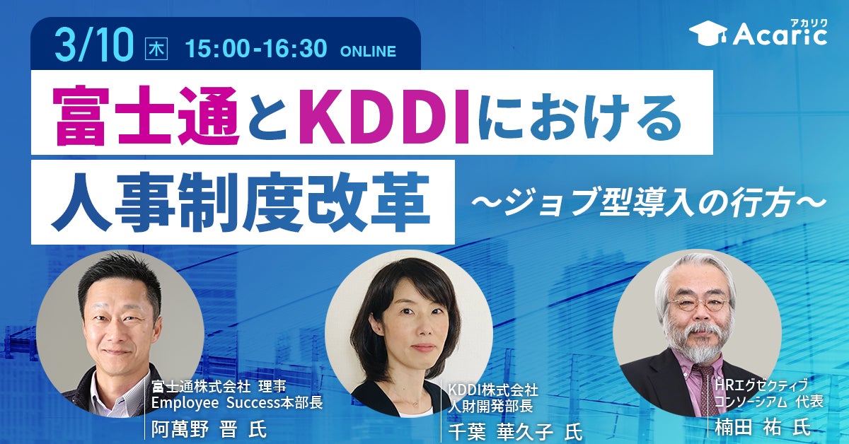 大学院生・研究者のキャリア支援を行っている株式会社アカリク(本社:東京都渋谷区、代表取締役:山田 諒、以下「弊社」)は、富士通株式会社 理事 阿萬野氏と、KDDI株式会社 人財開発部長 千葉氏を特別ゲストとしてお迎えし、『富士通とKDDIにおける人事制度改革』と題した人事改革に関するウェビナーを開催いたします。
