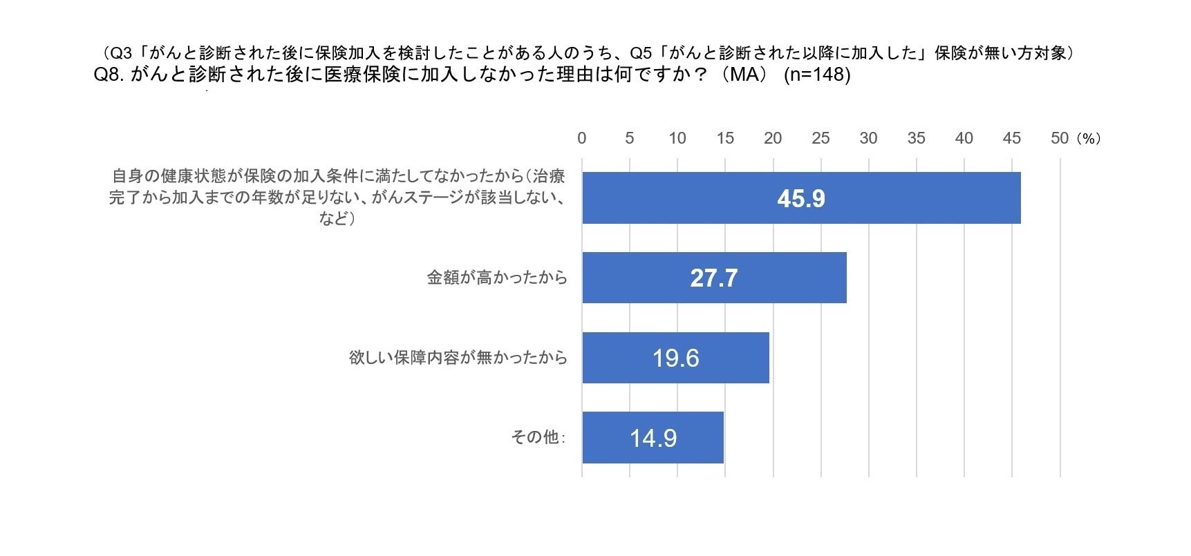- がんと診断された後に保険を検討したが実際に加入しなかった人の理由は、「自身の健康状態が保険の加入条件に満たしてなかったから」4割強、「金額が高かったから」約3割。7割以上の人が加入条件や金額面で断念している
