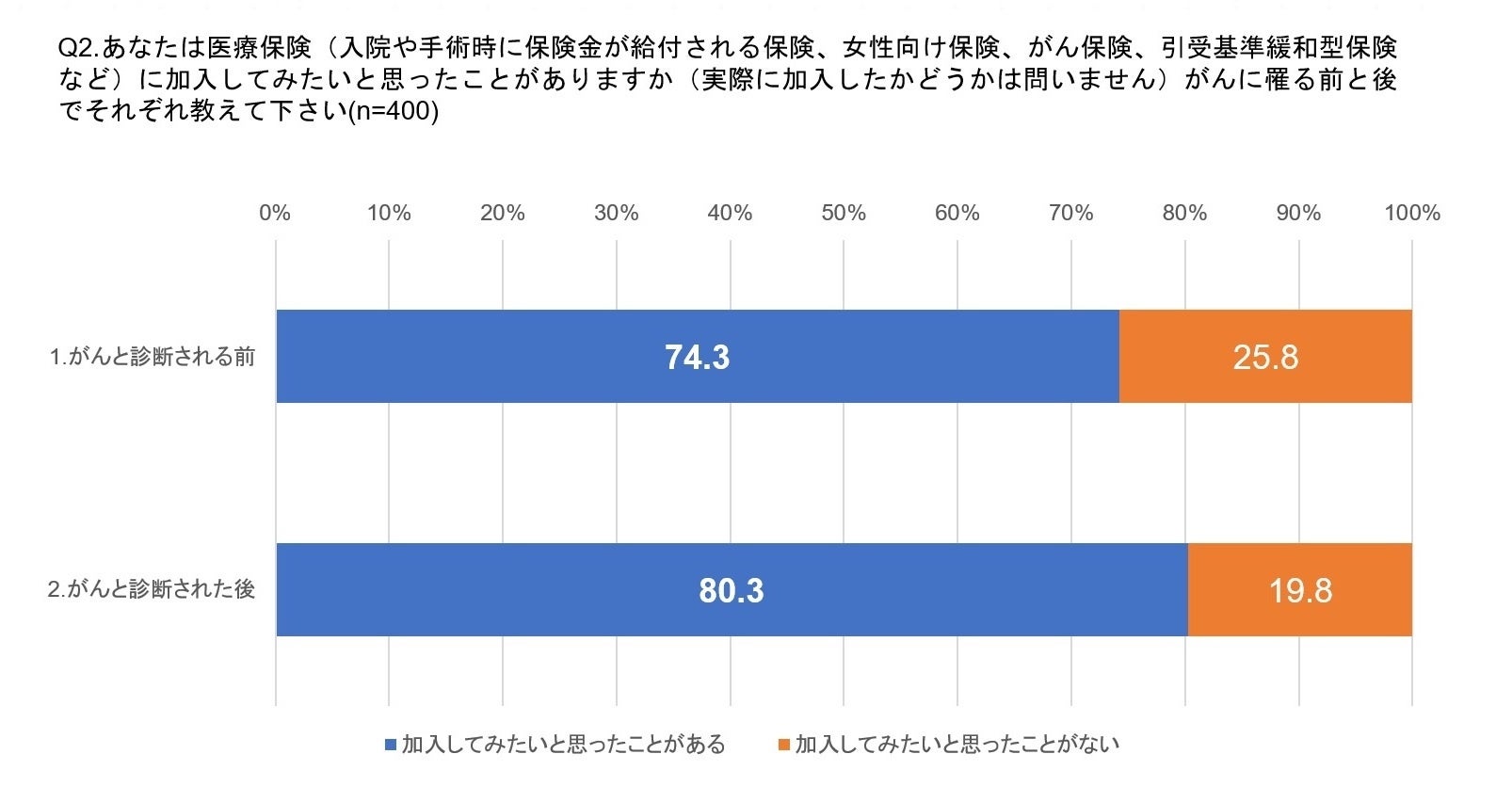 - がん経験者のうち8割が「がんと診断された後に医療保険に加入してみたいと思った」経験がある